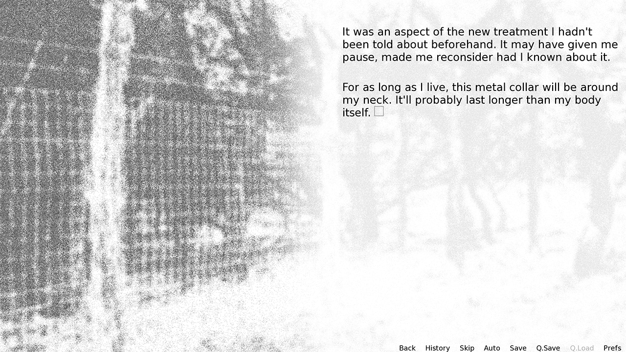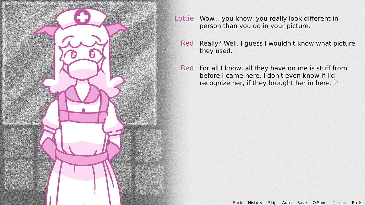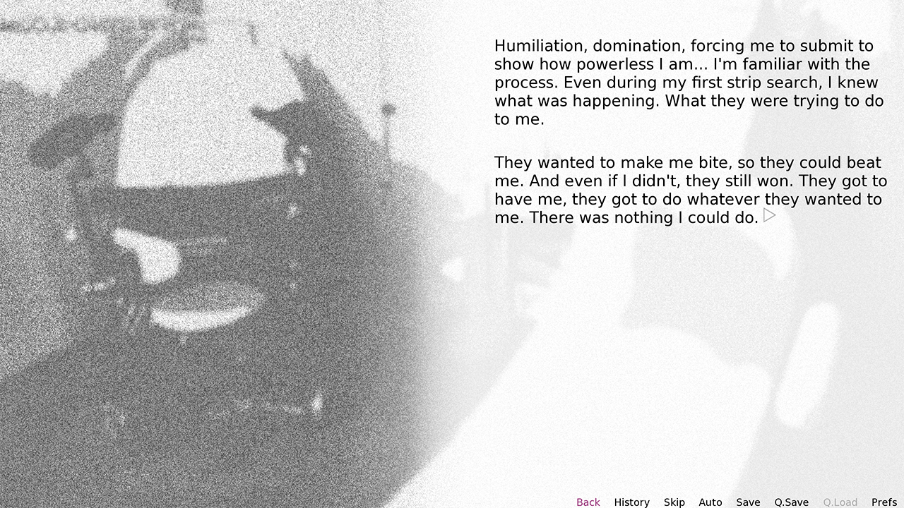 This was a delight to read. It clicks all of the boxes of the content warnings very well, so for anyone who is looking forward to the warnings, this is a great read. The few sprites were very effective, and each CG was very purposeful in delivering the scene's message. The prose is especially strong in the more gore-y descriptions, especially considering Red as the POV character.